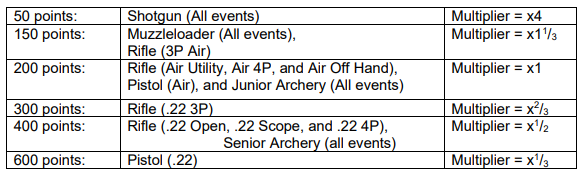 - To compete for the Marksman of the Year Award, you must compete in 5 events across 3 disciplines and make those events in the “MARKSMAN” column of the entry form for the El Paso County Competition each year. The disciplines are identified on the entry form as: Rifle, Pistol, Muzzleloader, Archery, and Shotgun. An example of an eligible group of events would be 3 rifle events, 1 pistol event, and 1 muzzleloader event. An ineligible entry would be any entry with either 4 rifle events or 3 events in one disciple (rifle or shotgun) and 2 events in a second discipline (rifle, pistol, muzzleloader, or shotgun). Scores are calculated by totaling the shooter’s final scores across the declared contests, except the scores will be modified to a maximum of 200 per event, or 1,000 total. Each events have a maximum potential score and a multiplier as follows: